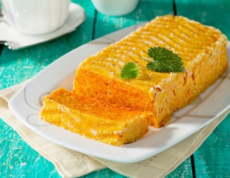 - Жидкую смесь соединить с натертой морковью и аккуратно перемешать. Форму для запекания смазать сливочным маслом и выложить в нее морковную массу. Выпекать в разогретой до 180 градусов духовке до образования румяной корочки, примерно 35 минут.