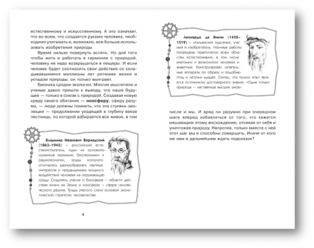«Бионика»В книгах понятно и невероятно увлекательно рассказывается о чудесах в физике, химии и биологии: о вечных двигателях и путешествиях на Луну, о безмоторном летании растений, о том, как добыть огонь с помощью льда и на каких на самом деле пяти китах стоит наша замечательная планета. Необычные способности птиц, рыб, зверей всегда вдохновляли людей на мечты о собственных открытиях. Но лишь спустя тысячелетия мы научились использовать решения, подсказанные мудрой природой. Колесо, компас, эхолот – все эти изобретения уже «придумала» природа, а человеку осталось только адаптировать их под себя. Автор книги – известный учёный-физик Александр Леонович – рассказывает не только о свершенных открытиях, но и о тех, которые мы ещё можем сделать, если будем внимательнее присматриваться к удивительным живым организмам. Книга рекомендована для среднего школьного возраста, но будет интересна и взрослым.