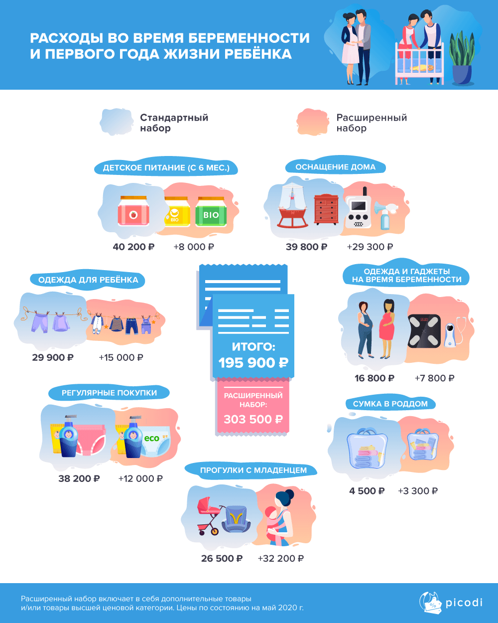 Суммируя все покупки, связанные с беременностью и первым годом жизни ребёнка, можно сказать, что траты на базовый набор составляют 195900 рублей, а на расширенный — 303500 руб.