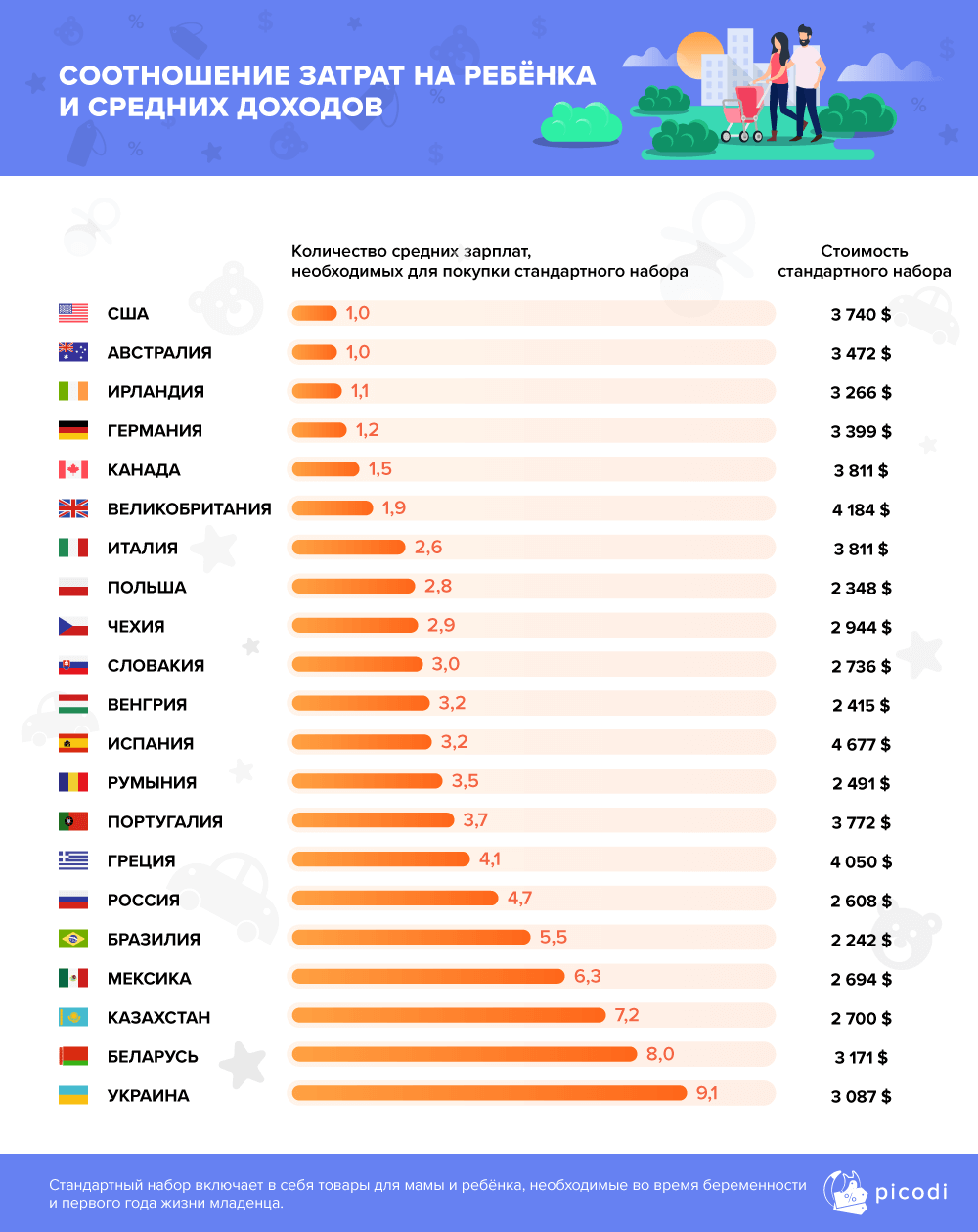 Аналитики Picodi.com подсчитали, сколько могут составить траты, связанные с появлением ребёнка: набор одежды во время беременности, сумка в роддом, оснащение дома при подготовке к появлению новорождённого и его содержание в течение первого года жизни.