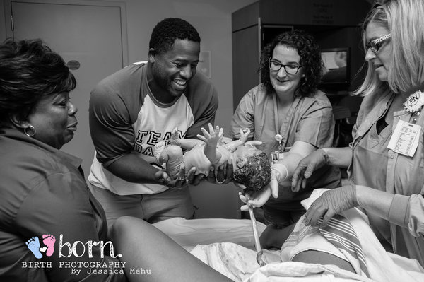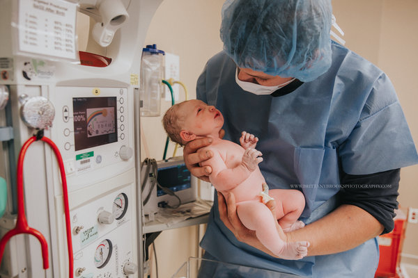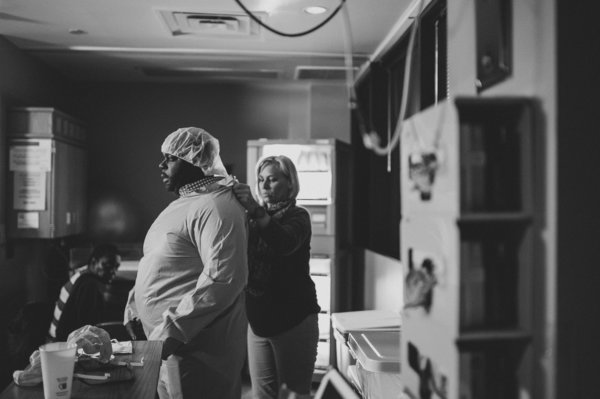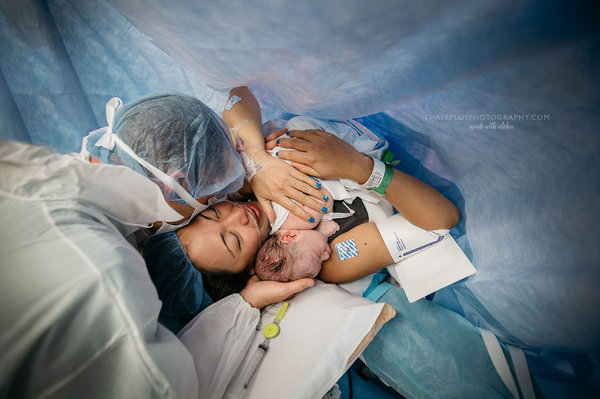 «Это были очень семейные роды: Кесарево сечение с отложенным пережатием пуповины и незамедлительным помещение ребенка в положение кожа-к-коже. Эти моменты были прекрасными. Я никогда не видела, чтобы отец принимал настолько непосредственное участие в процессе. На фото он помогает взвесить и измерить ребенка сразу после Кесарева».