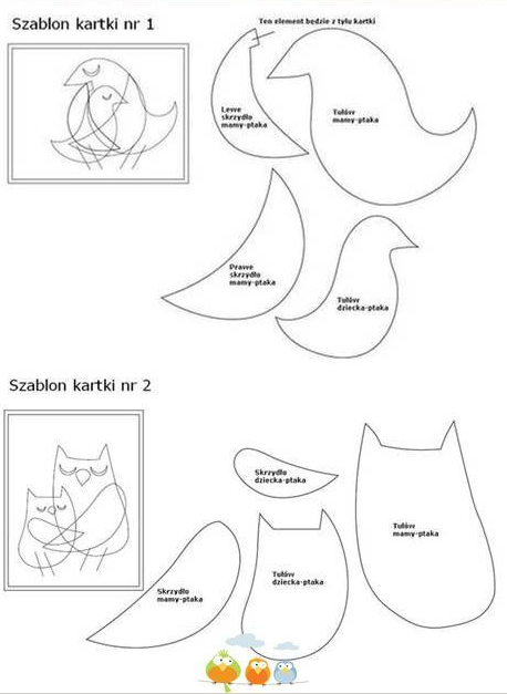 Очень нежная открытка на 8 Марта из бумаги: птичка мама обнимает своего птенца. Для этой апплликации вам понадобятся картон, цветная бумага, ножницы, клей и шаблон.