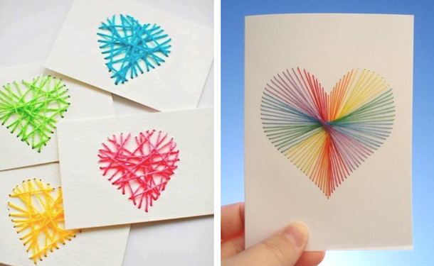 Эти открытки делать не так сложно, как может показаться на первый взгляд. На плотный картон нанесите контур сердца или цветка, и просто соединяйте при помощи иголки и ниток противоположные края рисунка. С таким заданием справится даже ребенок. Детальный мастер-класс с фото можно посмотреть в нашей статье "Как сделать своими руками открытку с вышитым сердцем".