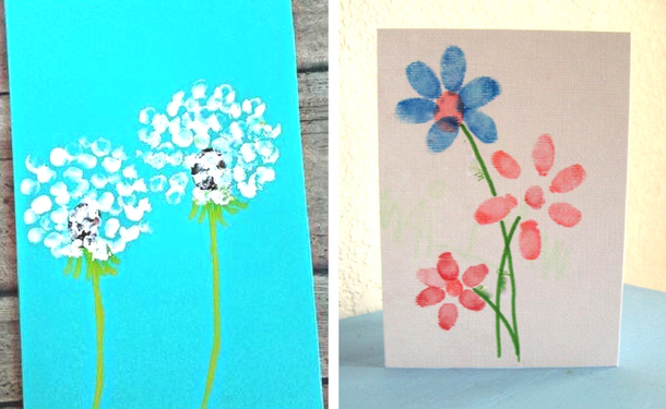 Эти варианты открыток на 8 Марта подойдут для самых маленьких. Детям нужно будет всего лишь обмакнуть пальцы в краски и несколько раз ткнуть в рисунок.