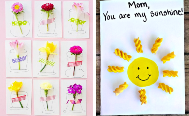 Оригинальный вариант открыток - аппликация из того, что есть под рукой: будь то живые цветы или макароны. Кстати, можно предложить самым маленьким детям сделать своими руками в подарок маме на 8 Марта - бусы из макарон.