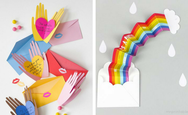 Представьте удивление мамы, когда она получит такой сюрприз в конверте. В первом случае это открытка в виде двух ладоней, с сердцем внутри. А во втором - радуга из бумаги, сложенная гармошкой. Добавьте трогательное поздравление с 8 Марта и все! Подарок своими руками готов!