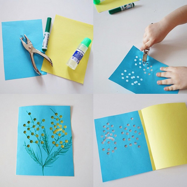 Необычную открытку для мамы на 8 Марта можно сделать с помощью дырокола и яркой бумаги. Техника максимально проста, самое главное – найти дома дырокол. Покупаем желтую и голубую бумагу и начинаем творить.
