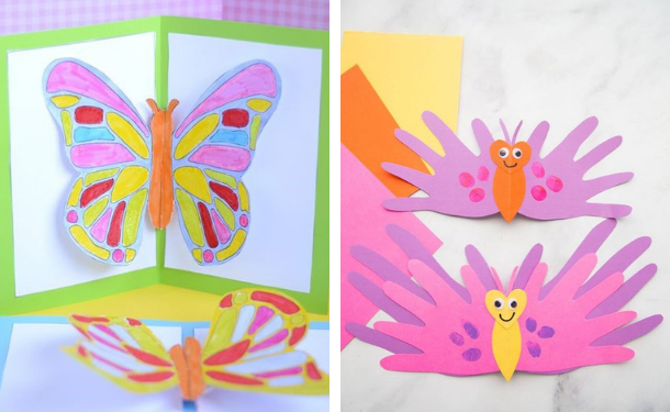 Второй вариант открытки с бабочкой на 8 Марта. Обводим детские ладошки на бумаге, вырезаем получившиеся фигуры - это будут крылья бабочки. Затем остается нарисовать и вырезать туловище, голову, и склеить все детали.