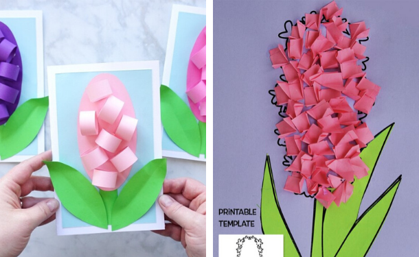 Открытку с гиацинтами можно сделать в виде аппликации из цветной бумаги, как показано на картинках ниже.