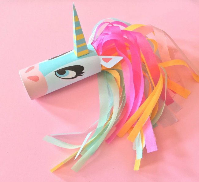 Можно также сделать единорога с гривой, которая будет развеваться на ветру. В таком случае картонная втулка послужит основой для головы, к которой надо будет приклеить разноцветные бумажные полоски. Для такой воздушной поделки из картонной втулки можете позаимствовать мастер-класс, как сделать огнедышащего дракона. Принцип и там, и там одинаковый.