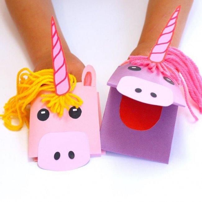 Чтобы разыгрывать сценки и обыгрывать истории из сказок о единорогах, можно использовать не только пальчиковые игрушки из кукольного театра. Сделайте с ребенком смешных единорогов на руки.
