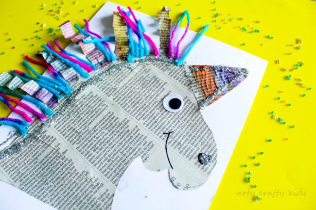 Для такой аппликации понадобятся лишь старые газеты, клей, ножницы и немного разноцветных ниток. Мордочку единорога можно нарисовать или использовать детали, вырезанные из бумаги. У ребенка не только получится интересная аппликация своими руками, но и возможность научиться, как можно повторно использовать многие материалы.