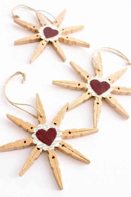 Если каждую прищепку разобрать, а потом склеить заново, но уже в форме снежинок, можно получить вот такой прекрасный декор на стену. Такие оригинальные снежинки можно оставить в своем натуральном цвете или закрасить красками, чем с удовольствием и займутся дети.