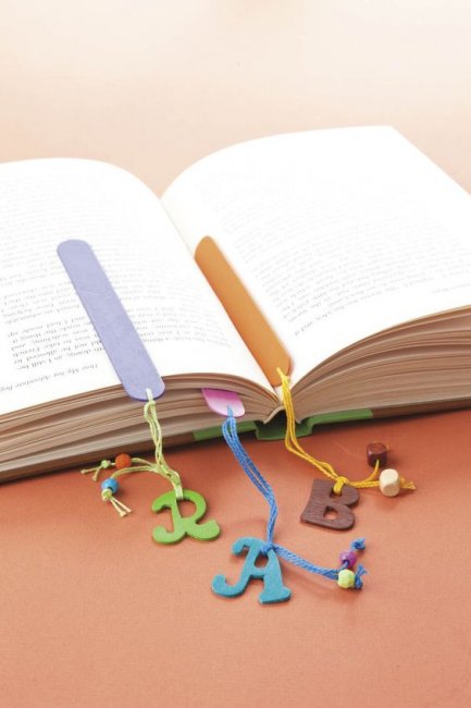 Закладки для книг также можно сделать из палочек для мороженого. Самый простой способ — раскрасить палочку красками. Вариант посложнее — приклеить фигурку или прицепить букву на нитке. Выбор за вами!