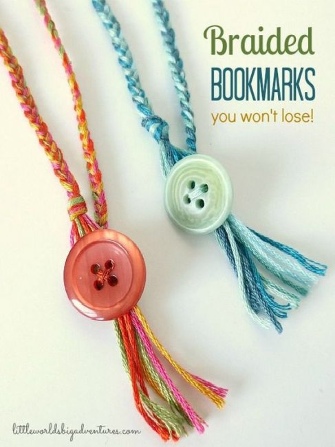 Нитка для вязания, заплетенная в косичку, и красивая пуговка — вот и новая закладка для любимой книги, которую очень просто сделать своими руками. На одном конце прикрепите пуговицу, а на другом сделайте петлю, чтобы "застегнуть" закладку.
