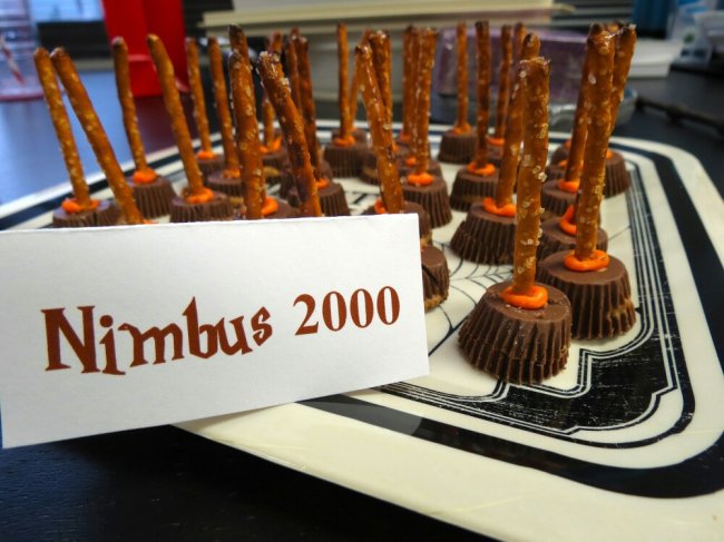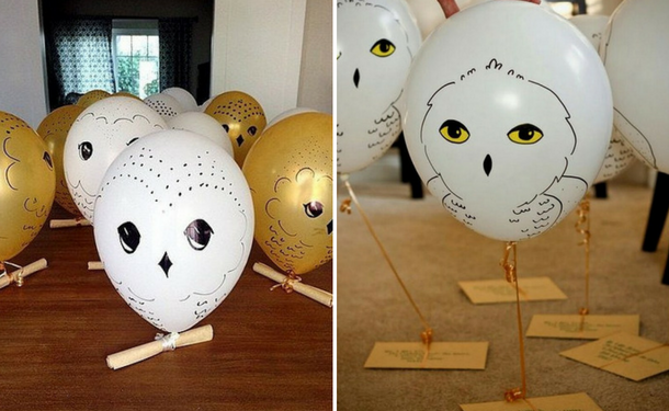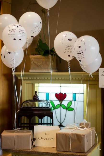 Из белых воздушных шаров сделайте полярных сов, чтобы украсить помещение. Также под потолком, на полках и на стенах развесьте паутину, летучих мышей, сделанных из марли привидений. Не забудьте расставить атрибуты из мира магии: шар с предсказаниями, гадалки-оригами для детей, метлы, таблички с призывами спасти Добби, волшебные палочки, которые можно сделать из обычных веток.