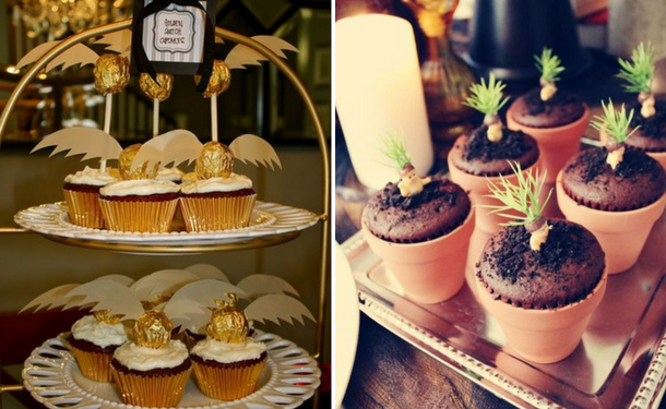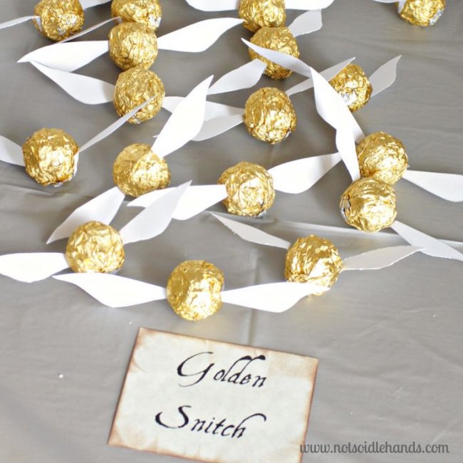 Даже обычные конфеты в блестящей обертке можно подать оригинально — в виде снитча. Вам потребуется лишь приделать небольшие крылья из бумаги к конфетам.