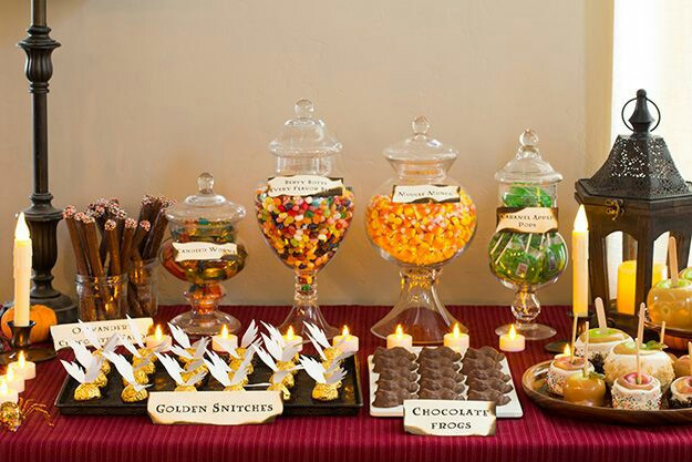 Кенди-бар. Чтобы оформить кенди-бар, используйте атрибутику Хогвартса, факультетов, эмблемы и портреты Гарри Поттера и его друзей, а также посуду "под старинку", емкости необычных форм. Фантазируйте и проявляйте креатив, тогда оформление станет настоящим шедевром.