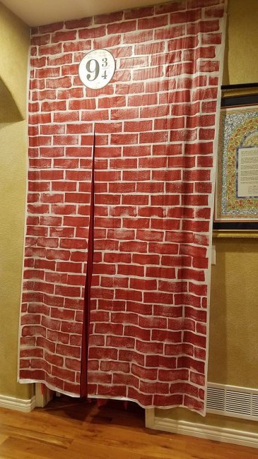 Как попасть в волшебный мир Гарри Поттера? Пройти сквозь кирпичную стену платформы 9? на вокзале Кингс-Кросс! Чтобы сделать такой вход, вам понадобится ткань, кирпич с краской, которым следует наделать отпечатки на ткани, и табличка с указанием платформы. Завесьте тканью вход в комнату, где будет пиршество, сделав разрез посредине.