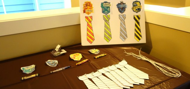 Дресс-код праздника. Вы можете предупредить гостей заранее о дресс-коде вечеринки в стиле Гарри Поттера или подготовить все для детей своими руками, например, галстуки каждого из факультета. Их можно пошить из ткани или сделать из картона. Каждый ребенок выбирает желаемый факультет и сам раскрашивает себе галстук. Черные мантии, волшебные палочки, остроконечные шляпы, очки — все это элементы нарядов в стиле Гарри Поттера.
