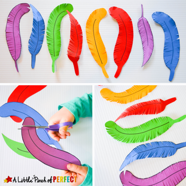 Еще одно упражнение для развития мелкой моторики - это разрезание бумажных перьев. Вырежите из цветной бумаги перья и нарисуйте по центру линии. Задача ребенка - делать надрезы по направлению к центру пера, не заходя за линию.