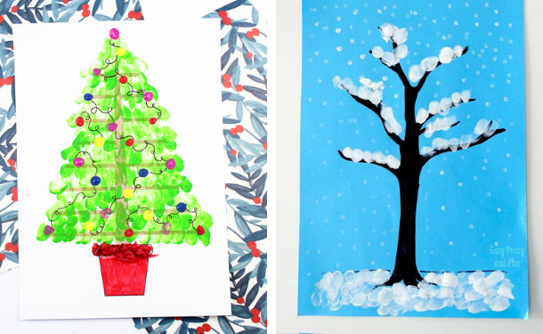 А ось і ажурні зимові деревця. Сніг можна напрісовати пальчиками. Якщо ви шукаєте вироби на тему "Зима" або "Новий рік" для молодших груп дитячого садка, то вам знадобляться ідеї новорічних листівок для малювання пальчиками.