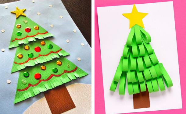 Чтобы сделать эту красоту, вам в помощь картон, цветная бумага, тонкие бумажные салфетки, видео-уроки как сделать елочку из бумаги, а также другие идеи для поделок в сад на тему зима и Новый год из нашей подборки.
