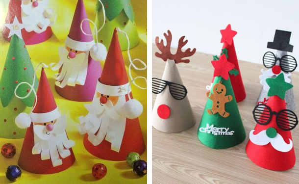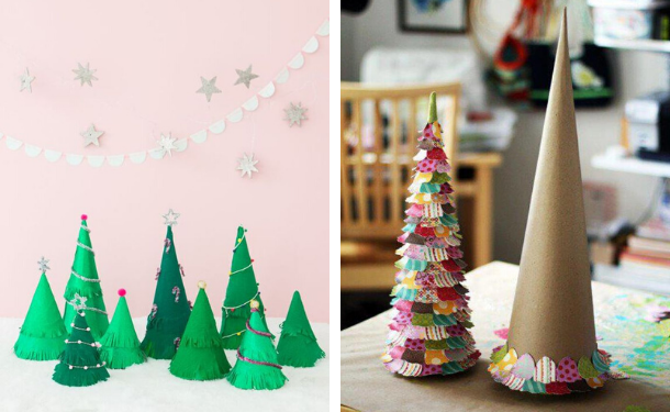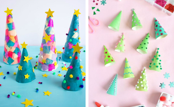 Эта поделка подойдет для детей любого возраста. Сделайте конус из картона. И потом предложите детям украсить его. Для украшения можно использовать, что угодно: вырезанные круги или бахрому из цветной бумаги, блестки.