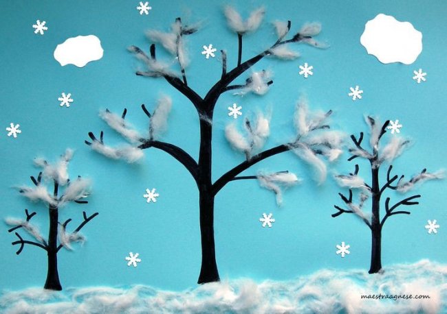 А вот и ажурные зимние деревца. Снег можно наприсовать пальчиками. Если вы ищите поделки на тему "Зима" или "Новый год" для младших групп детского сада, то вам пригодятся идеи новогодних открыток для рисования пальчиками.