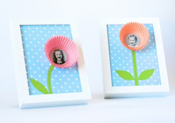 Например, вот такую чудную открытку в рамке, с цветком из бумажной формы для кексов, и фото ребенка в серединке.