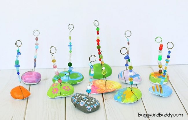 Чтобы сделать такие держатели фотографий в подарок для бабушки на 8 Марта, ребенку понадобятся камни, кисти, акриловые краски, бусины проволока и кто-т о взрослый, кто умеет пользоваться пассатижами.