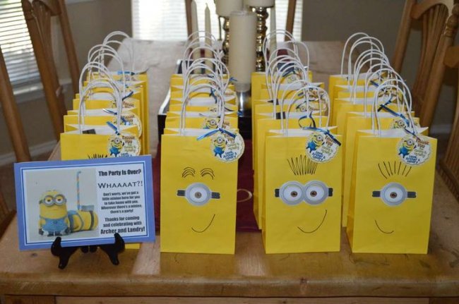 По окончанию праздника каждому из гостей вручите пакетик с угощениями. Пакетики, разумеется, также должны быть оформлены в стиле миньонов, чтобы все приглашенные еще долго вспоминали праздник, на котором они побывали.
