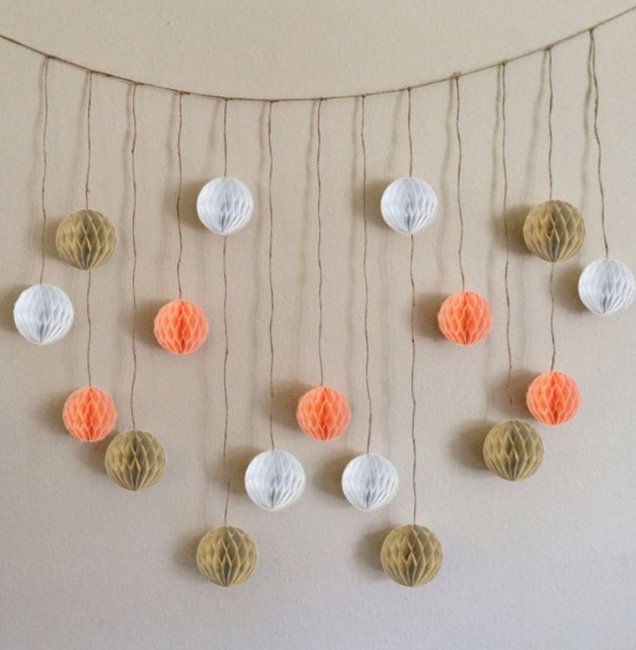 Не стоит забывать и про гирлянды из гофрированной бумаги, ведь если изменить подход и проявить смекалку, получится современный и очень стильный декор на стены.