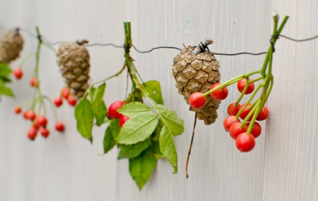 Шишки, ягоды, желуди и даже овощи могут стать отличным материалом для необычных гирлянд, чтобы украсить ими праздничный зал на осеннюю тему, ведь сценки и рассказы о дарах осени всегда присутствуют в сценарии праздника для дошкольников. Ну и, конечно же, засушенные листочки или листья с рисунками, которые можно нанести красками, мелками или маркерами.