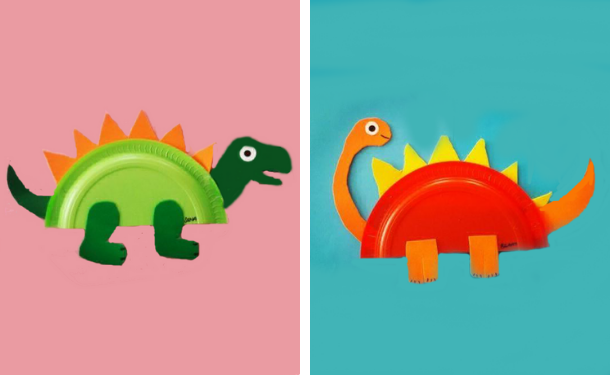 Разрезаем одноразовую тарелку пополам — это туловище. Из цветного картона вырезаем голову, ноги, хвост и шипы. И клеим к туловищу. Все, динозавр готов.