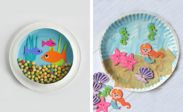 Дети могут сделать, что угодно из одноразовых тарелок. Достаточно дать им немного краски, клея и цветной бумаги, как тут же выстроится ряд поделок на морскую тематику: рыбы, крабы, медузы и осьминоги, черепахи и сказочные русалки.