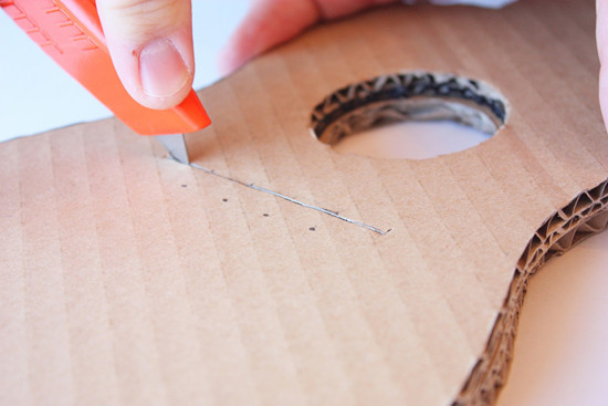 Крепим порожки к нашей картонной гитаре. Для начала ножом для бумаги проводим по 7сантиметровой линии под кругом.