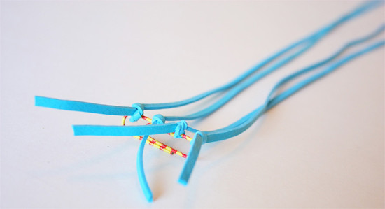 Крепим струны к гитаре из картона. Берем материал, который мы приготовили для струн: леску или резинку. Отрезаем 4 струны по длине гитары, плюс 7-8 см для креплений.