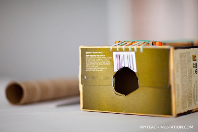 На самом деле, что есть под рукой — то и пригодится. Возьмите картонную коробку (из под хлопьев — подойдет), вырежьте круг посередине. Приклейте гриф, вырезанный из картона или втулку от бумажных полотенец.