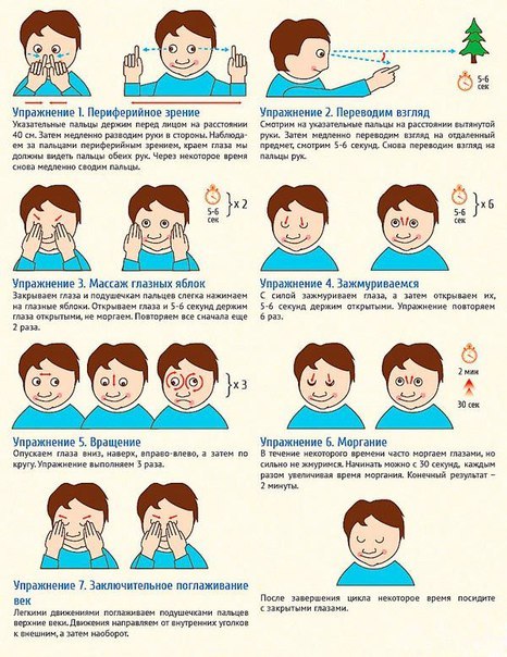 Плотно закрыть глаза, досчитать да пяти и широко открыть глазки; (упражнение для снятия глазного напряжения)