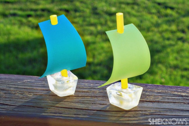 Достаньте кубики льда из лотка. Прикрепите парус к соломке, а затем поместите лодку в воду. Можете устроить гонки ледяных парусников!