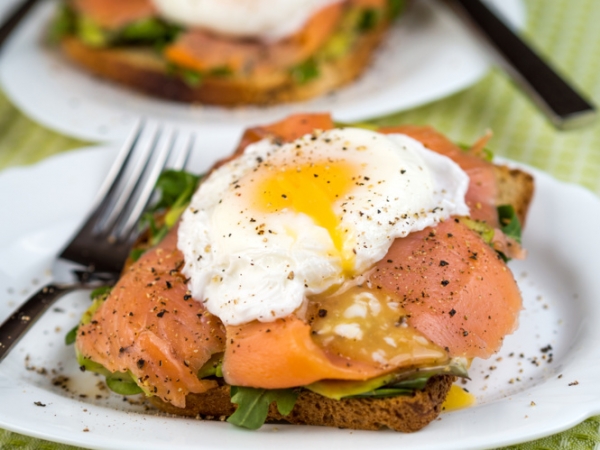 Разогрей хлеб в тостере(можнож применять духовку либо аэрогриль. Или сковородку, черт бери!). На горячую сковороду(иную, желая можнож и ту же)налей немножко оливкового масла, вылей туда предварительно взбитое яичко, доведи его до готовности. Затем на сковороде(да все на той же, у нас обыкновенные бутерброды)обжарь спаржу. Готовые тосты намажь сливочным сыром, выложи на их спаржу и салатные листья. На один тост положи яичко, на 2-ой — семгу, поперчи по вкусу.