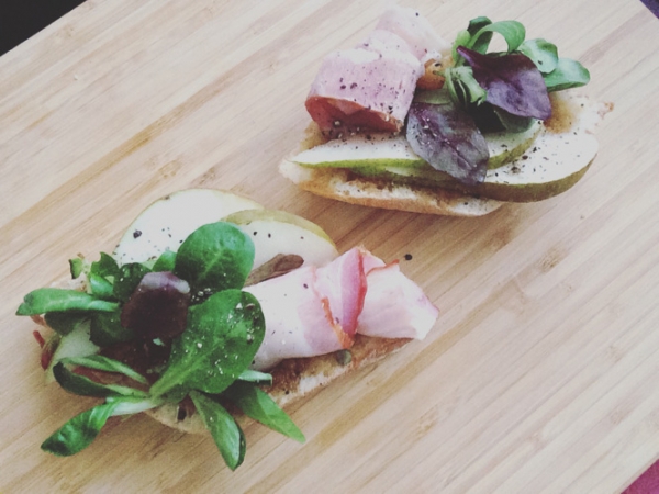 Смешай мед и горчицу, обмажь получившейся смесью чиабатту. Грушу нарежь дольками. На хлеб выложи салатную смесь, грушу и бекон. Посоли, поперчи по вкусу.