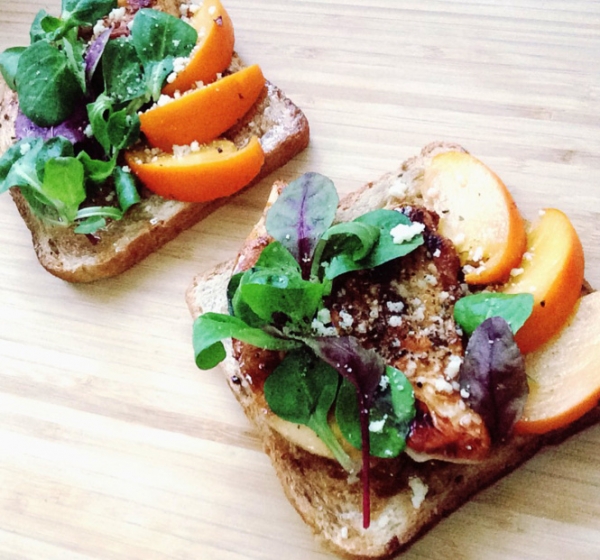 Подогрей хлеб в тостере(ну либо да, на сковороде). Обжарь на сковороде до готовности куриное филе в оливковом масле и соевом соусе. Нарежь дольками хурму. Смешай мед и соевый соус, намажь получившейся смесью готовые тосты. На их выложи зелень, куриную грудку, хурму. Сверху посыпь сыром и поперчи, окончательно.