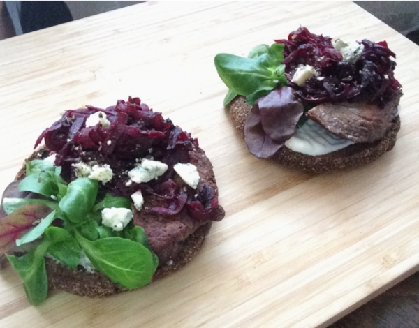 Кусочки хлеба обжарь либо подогрей в духовке. Смешай сметану и хрен и намажь соусом приготовленный хлеб. Выложи на него мясо, салатные листья, свеклу.
