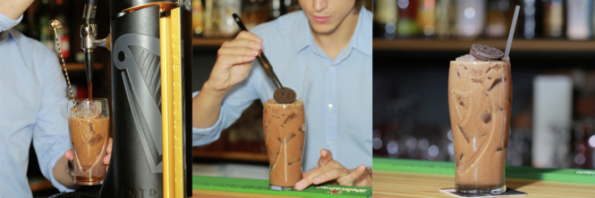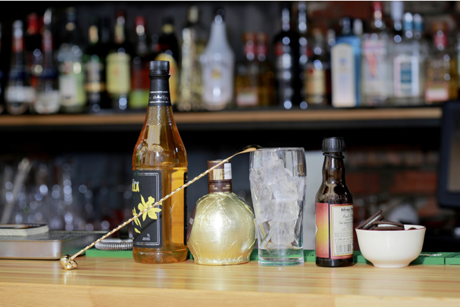 В большой бокал кладешь несколько кубиков льда, добавляешь ванильный сироп, шоколадный ликер и капаешь немного биттера. Шоколадный биттер — это барменское секретное оружие. Его не так просто найти, поэтому можно использовать «Фернет-Бранка» или что-то подобное. Все перемешиваешь и доливаешь сверху пиво. Если заедать коктейль шоколадным печеньем, картина будет завершенной.