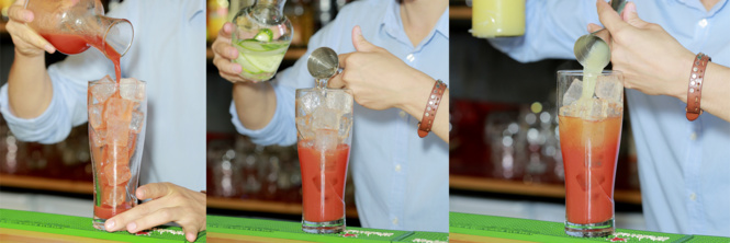 Можно попробовать отслоить пиво — подставить ложку, чтобы уже с нее пиво стекало в стакан. Томатный сок намного плотнее пива, и оно ляжет сверху. Для эстетики в бокал можно вставить стебель сельдерея.