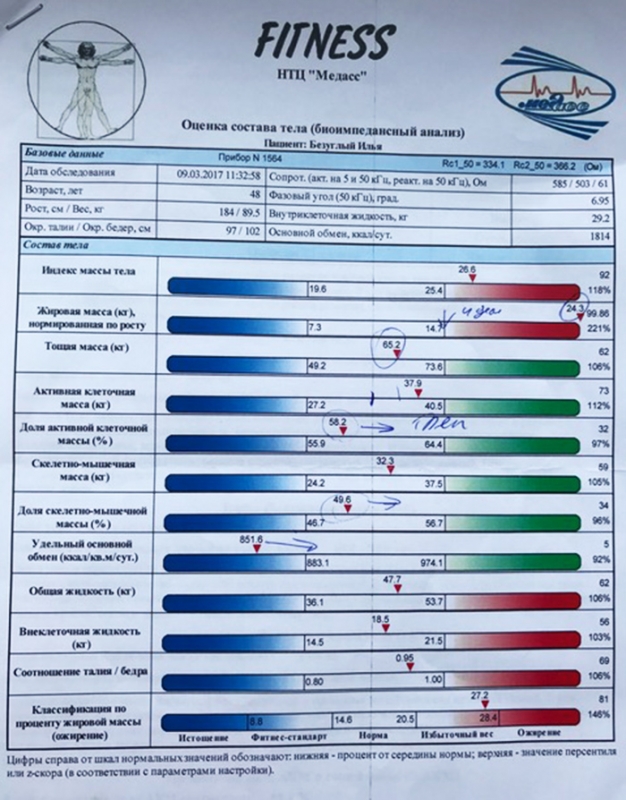 Поскольку мы с Х-Fit решили избавляться от моего пуза не только по-быстрому, но еще и по-умному, простого взвешивания для определения исходных параметров и динамики изменений недостаточно. Без биоимпедансного анализа умным физкультурникам не обойтись. Очаровательная хозяйка медицинского кабинета в клубе на Чистых прудах подключила электроды к моему неидеальному телу в двух местах, не больно пропустила через меня ток и выдала красивую распечатку, показывающую, из чего я сделан. Лень и любовь к пиву и сладкому умная машинка не измеряет, а вот жировую массу, нормированную по росту, показывает довольно точно. Извольте видеть: 24,3 килограмма. При здоровой норме в 14,7! Никогда бы не подумал, что все настолько запущенно. К тому же выяснилось, что удельный основной обмен у меня несколько понижен и индекс массы тела в красной зоне — избыточный вес. Доктор, я умру?..