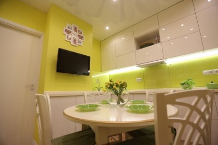 Немаловажен и выбор материала. Анастасия Каспарян рекомендует обратить внимание на массив или шпон древесины под лаком, а также МДФ, покрытые лаком. Для столешницы Анастасия Каспарян рекомендует использовать гранит или искусственный камень. Выбирая кухонный фартук, многие дизайнеры сходятся во мнении, что самый удобный материал – это стекло. Дизайнер Ольга Поварова утверждает, что стекло может быть как цветным, так и прозрачным, и за ним можно разместить любой коллаж из любимых фото или рисунков. А, благодаря легкости монтажа и демонтажа, оформление можно менять чаще, чем при замене плитки.Не забудьте и об удобстве обеденного стола. Дизайнер Антон Печеный рекомендует выбирать обеденный стол из расчета 60-70 см на 1 человека. Идеальный стол для 4-х человек - 120-140 см в длину.Если же пространство кухни объединено с другими помещениями и предполагает несколько функций, здесь не обойтись без многофункциональной мебели. Архитектор Наталья Гусева рекомендует использовать мебель-трансформер. К примеру, кровать, которая поднята и спрятана в шкаф днем, или стол, который может легко выдвигаться из кухонного гарнитура.