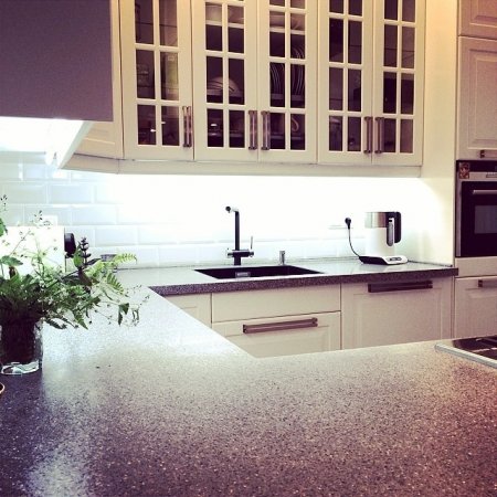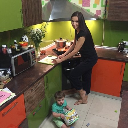 Опубликовав еще один снимок, в подписи к нему Ирена продолжила оду кухне: «Столешница из искусственного камня — лучшее, что со мной случилось за время стройки. Столешница — единственное, что приехало не на 3 месяца позже срока, а на 2 дня раньше даты по договору! Питерцы просто пришли и сделали свою работу идеально, не вынося мне голову про кривые стены (хотя они кривые!), не разводя на дополнительные сметы и т.д. В итоге я у них заказала еще и подоконники на все окна из самого простого белого камня Staron. И тоже все сделали круто. И смотрите, моя прелесть — раковина ВРОВЕНЬ со столешницей. И смеситель, из которого течет и обычная, и фильтрованная вода!»